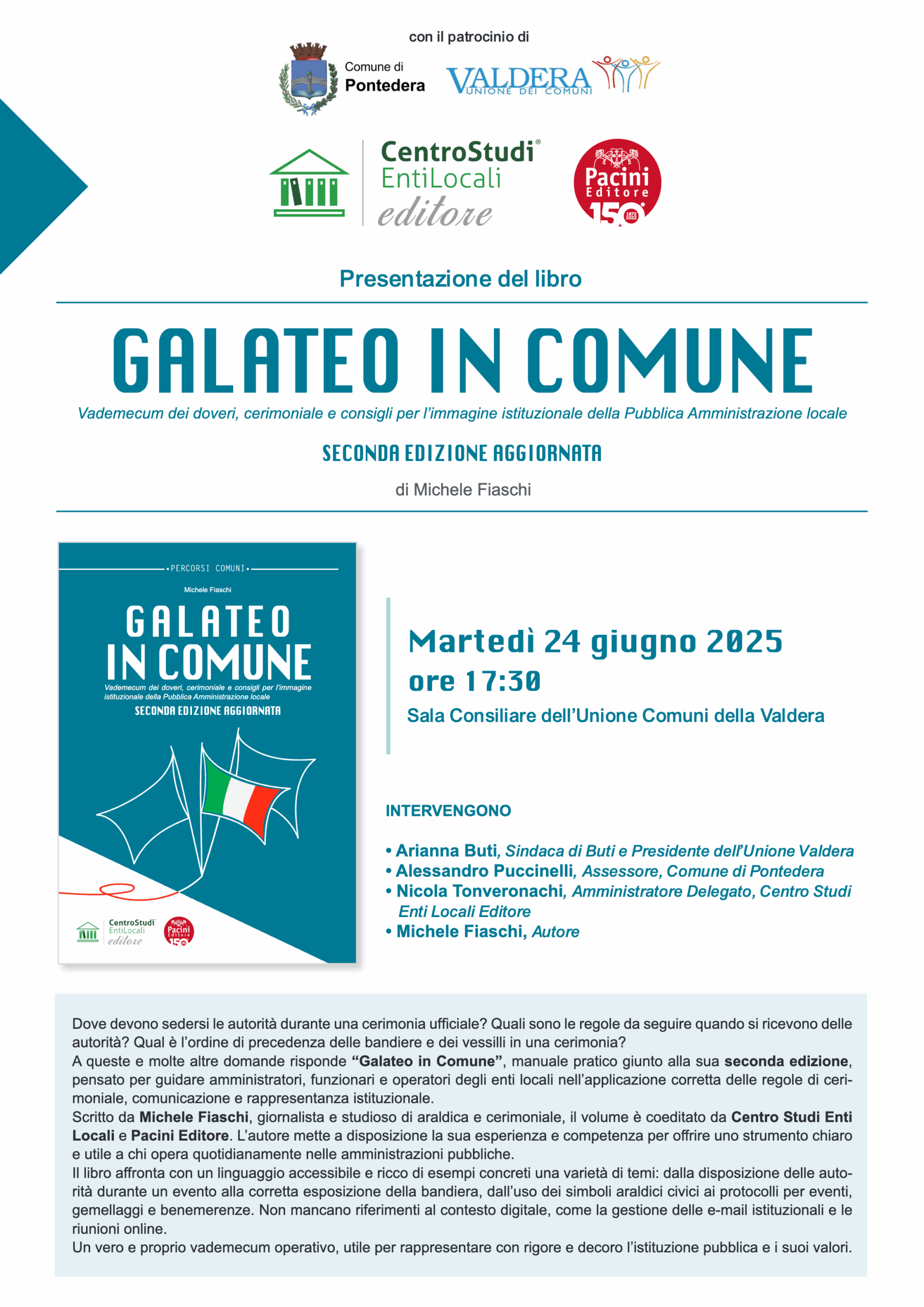 • Cerimoniale ed enti locali: il 24 giugno l’Unione Valdera ospita la presentazione del libro “Galateo in Comune” di Michele Fiaschi